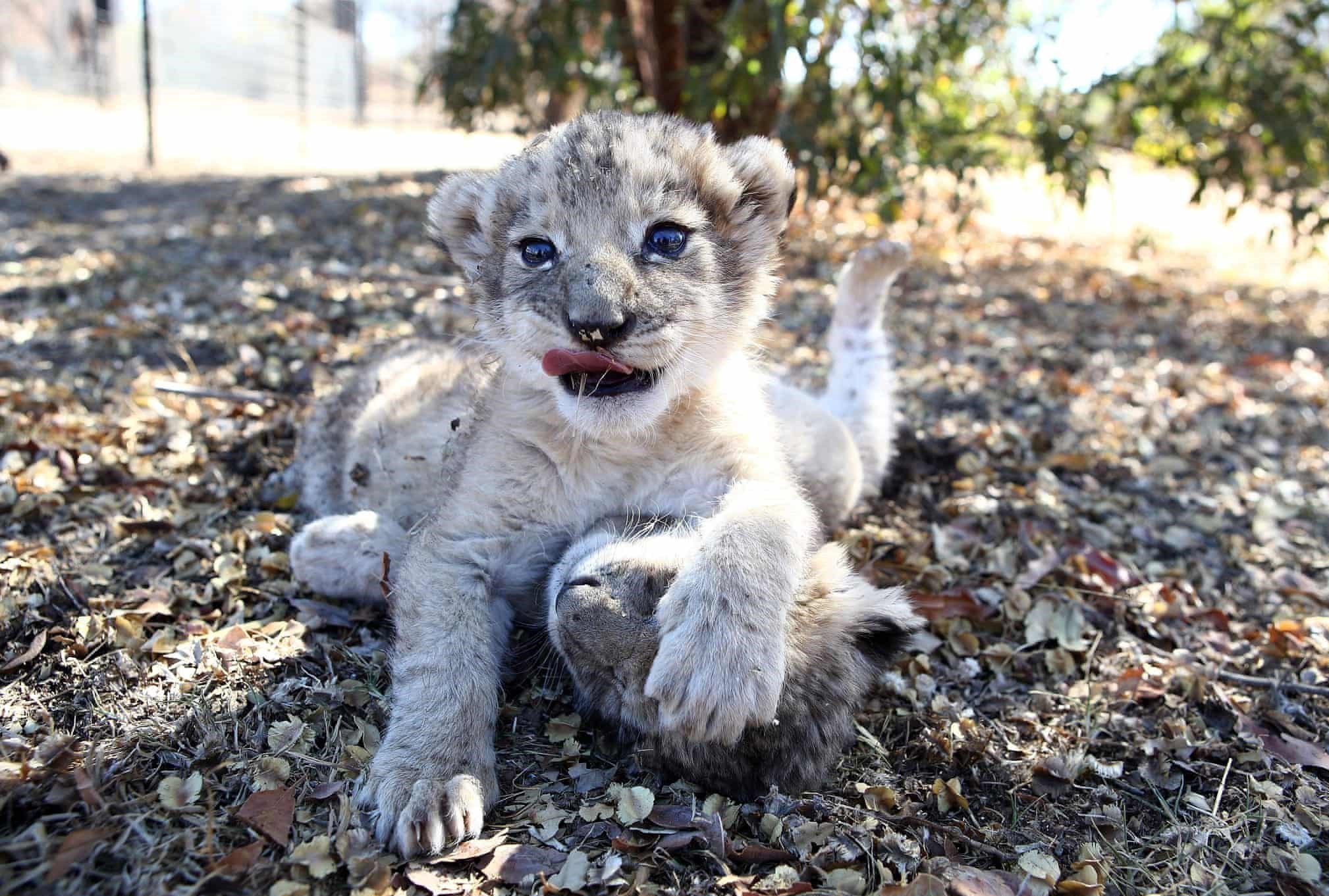 نخستین توله شیرهای حاصل از لقاح مصنوعی در سطح جهان در حال بازی در منطقه حفاظتشده اوکوتولا در آفریقای جنوبی.