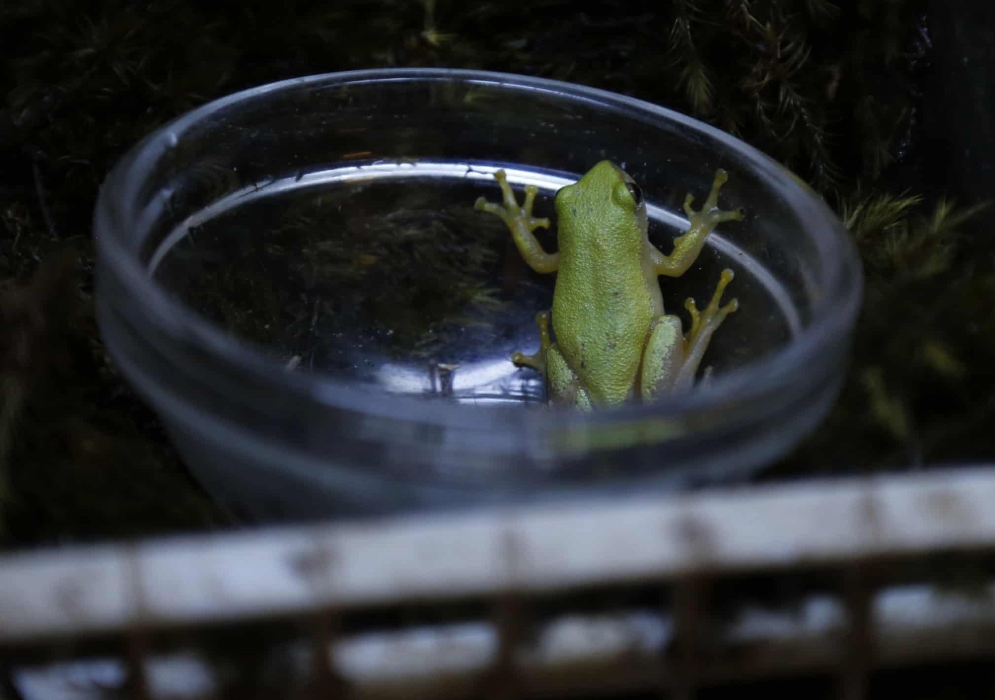 یک قورباغه جگن (Pickersgill's reed frog) در دوره تکثیر در اسارت در باغ وحش ژوهانسبورگ. فعالان محیط زیست قورباغههایی را که بعدها در سواحل کوازولو-ناتال رهاسازی میشوند پایش میکنند.