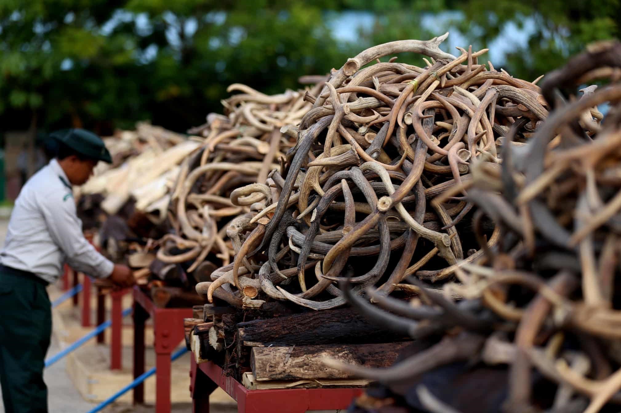 انبوهی از عاج فیل و سایر اعضای بدن وحوش در نایپیداو میانمار که از قاچاقچیان ضبط شده و بناست به آتش کشیده شود تا مبارزه با تجارت غیرقانونی حیات وحش را به نمایش بگذارد / عکس از: U Aung