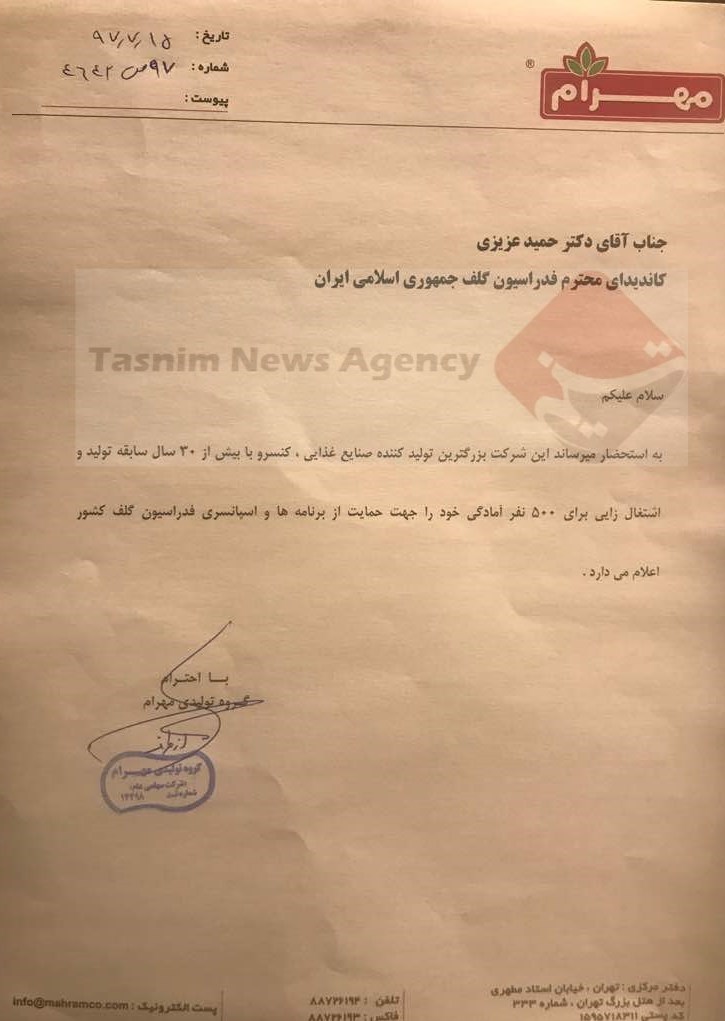 مدیر گروه تولیدی مهرام در پایان تاکید کرد: آقای گنجی در جریان نامه نبودند و این نامه را ما صادر کردیم. ما قصد داریم اگر عزیزی رئیس فدراسیون شود، متناسب با سیاستهای تبلیغی کمک کنیم.