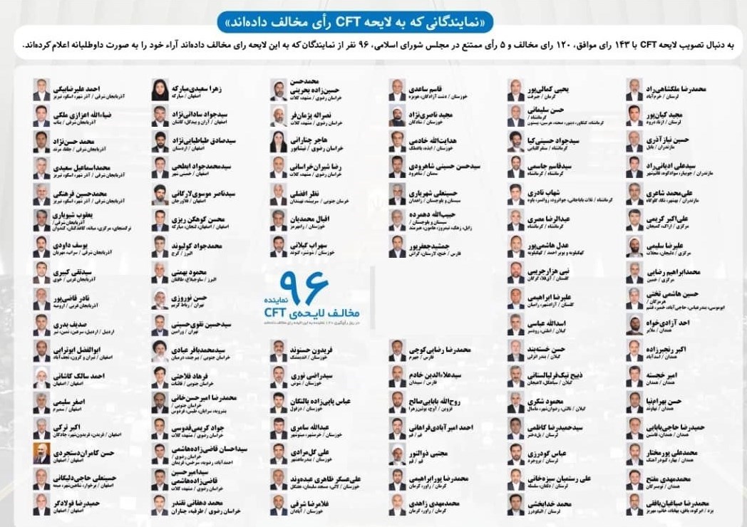 بر اساس این گزارش، اسامی 96 تن از نمایندگانی که در مخالفت با لایحه الحاق ایران به کنوانسیون مبارزه با تأمین مالی تروریسم (CFT) رأی دادند از سوی خبرگزاری تسنیم منتشر شد.