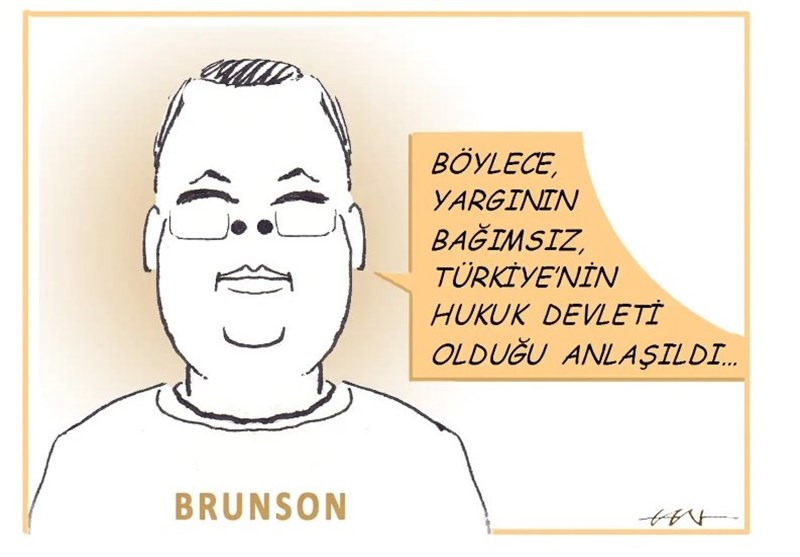 به گزارش گروه بینالملل خبرگزاری تسنیم، تان اورال، کاریکاتوریست مشهور ترکیه امروز در کاریکاتور خود به موضوع آزادی کشیش آمریکایی آندره برنسون پرداخته و از زبان او نوشته است: و این چنین بود که فهمیدیم دستگاه قضایی ترکیه مستقل است و دولتش حقوق محور!