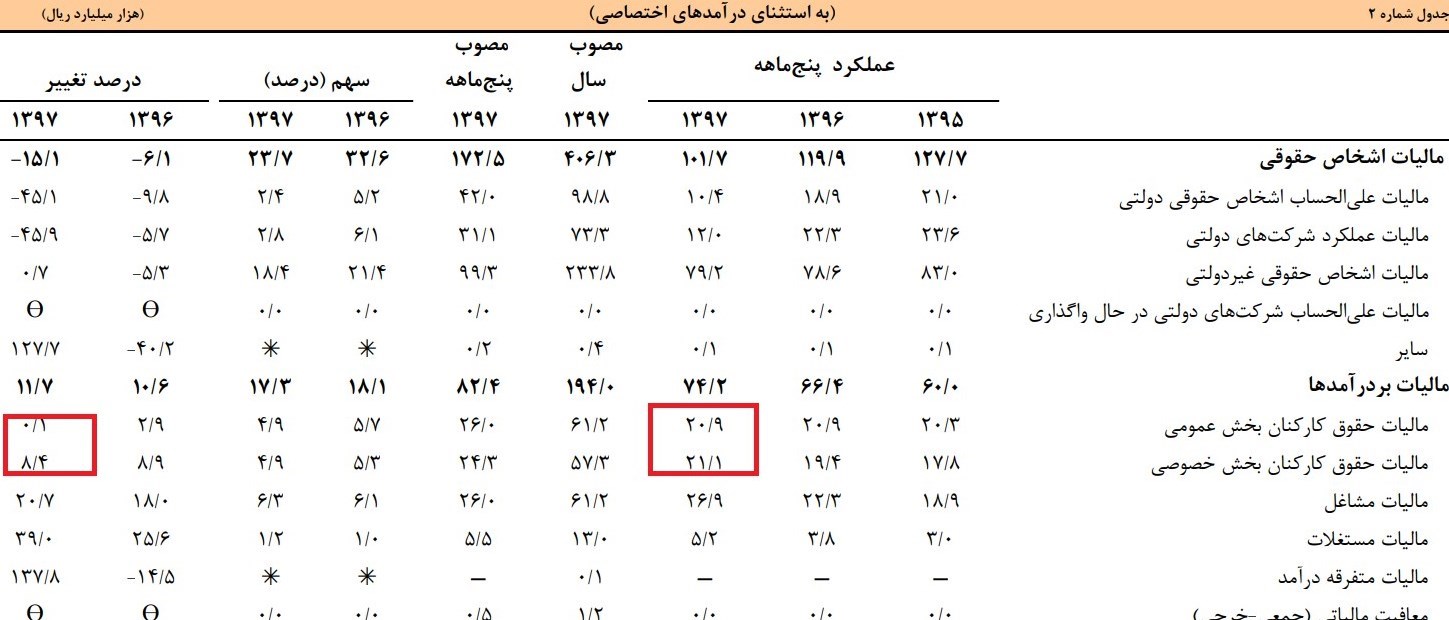 در این مدت 2000 میلیارد تومان مالیات از کارکنان بخش عمومی وصول شده که نسبت به مدت مشابه سال قبل تغییر محسوسی نکرده است. همچنین حدود2100 میلیارد تومان مالیات نیز از کارکنان بخش خصوصی وصول شده که مدت مشابه سال 96 حدود 8 درصد رشد کرده است.