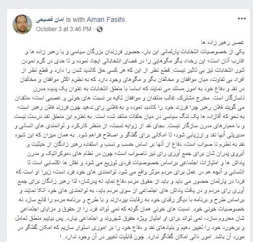 «امان فصیحی» مشاور فرهنگی معاون دوم رئیس جمهوری افغانستان، حضور فرزندان بزرگان سیاسی و رهبرزاده‌ها را یکی از خصوصیات انتخابات پارلمانی این دوره یاد کرده و می‌گوید: این رخداد، بگو مگوهایی را در فضای انتخاباتی ایجاد نموده و تا حدی در گرم نمودن تنور انتخابات نیز بی‌تاثیر نیست.