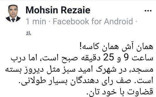 «محسن رضایی» یکی از کاربران فضای مجازی نوشت: همان آش همان کاسه؛ ساعت 9 25 دقیقه صبح است اما هنوز مرکز انتخاباتی در شهر «امیدسبز» آغاز به کار نکرده است.