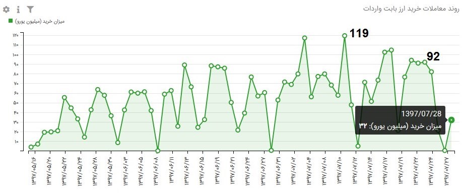 گفتنی است، روز گذشته حدود 32 میلیون یورو ارز توسط واردکنندگان از صرافیها خریداری شده است، این در حالی است که روز 25 مهر ماه 92 میلیون یورو ارز توسط صرافیها بهفروش رسیده است. همچنین در روز یازدهم مهر ماه رکورد فروش ارز در سامانه نیما شکسته شد و نزدیک به 120 میلیون یورو در یک روز به واردکنندگان فروخته شد.
