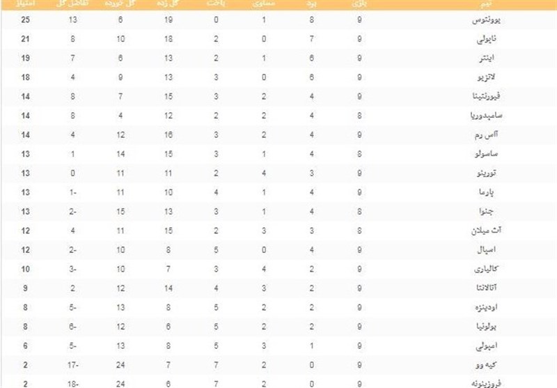 فوتبال جهان| جدول رده‌بندی سری A در پایان شب دوم از هفته نهم