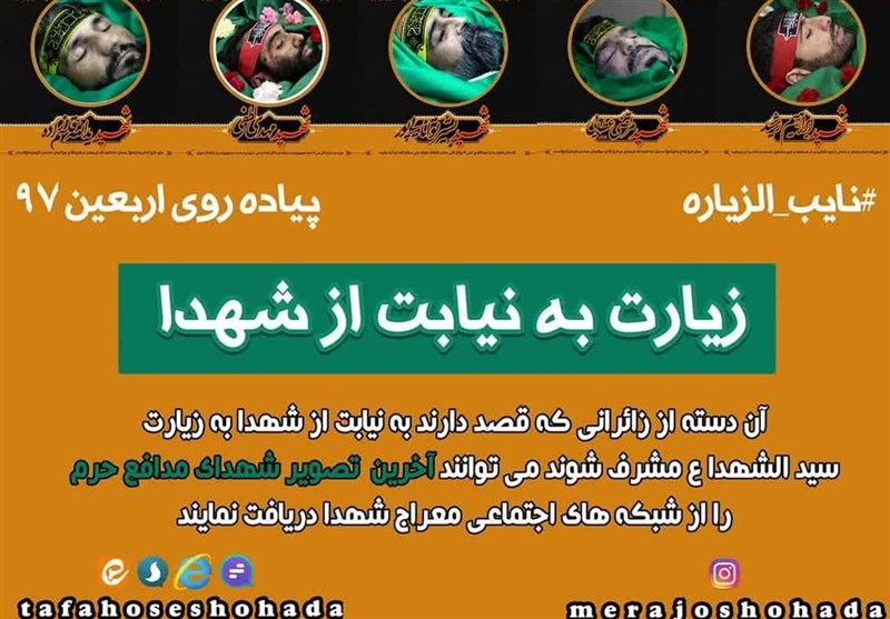 مجموعه تصاویر شهدای مدافع حرم با عنوان زیارت به نیابت از شهدای مدافع حرم به مناسبت حماسه عظیم راهپیمایی میلیونی اربعین  توسط کمیته جستجوی مفقودین ستاد کل نیروهای مسلح منتشر شد. در این مجموعه ده‌ها تصاویر از سیمای مبارک شهدای مدافع حرم در معراج شهدا منتشر شده است تا آن دسته از زائرانی که قصد دارند به نیابت از شهدا به زیارت حضرت سید الشهدا(علیه السلام)  مشرف شوند بتوانند آخرین تصاویر شهدای مدافع حرم را دریافت کنند.