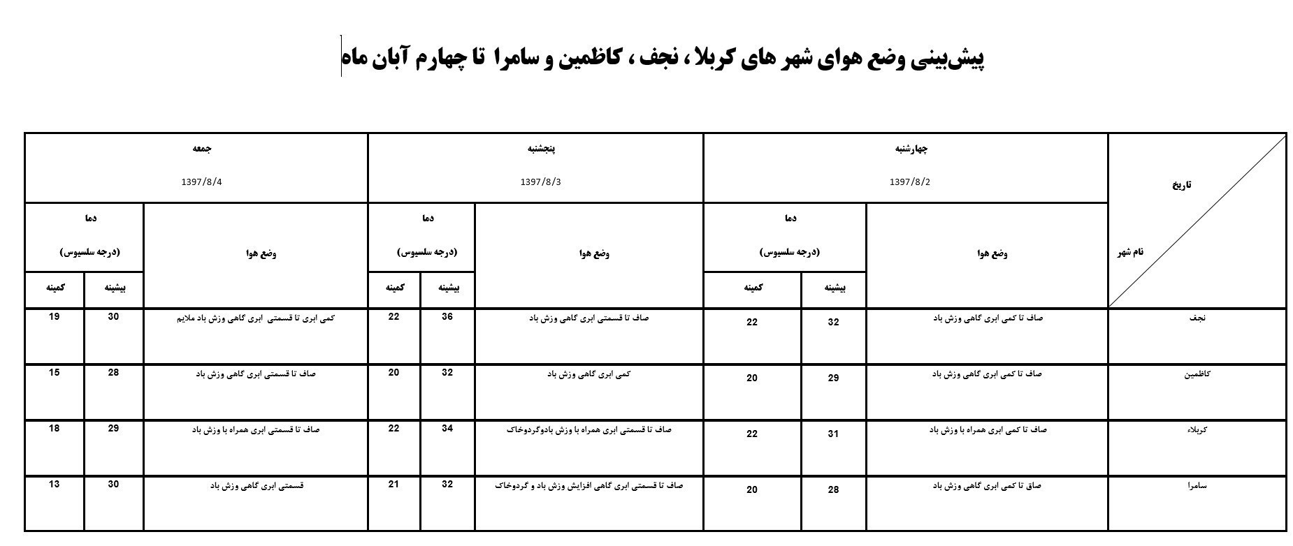 در ادامه پیشبینی وضعیت آب و هوا طی 3 روز آینده در شهرهای نجف، کربلا، سامرا و کاظمین تقدیم شده است (بر روی جدول زیر رایتکلیک و گزینه اول را کلیک کنید):