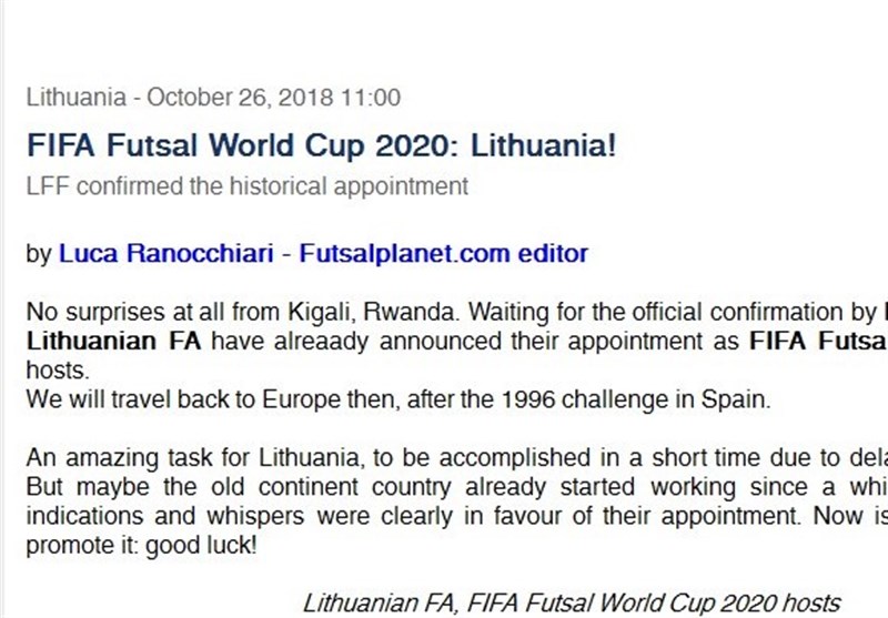 یکی از مباحث مهمی که در جلسه کمیته اجرایی فیفا مورد بررسی قرار گرفت، میزبانی جام جهانی 2020 فوتسال بود که در این بخش کشورهای ایران، ژاپن، نیوزیلند و لیتوانی نامزدهای کسب میزبانی جام جهانی بودند. سایت فوتسال پلنت اعلام کرد که کشور لیتوانی توانست میزبانی این مسابقات را به دست بیاورد.