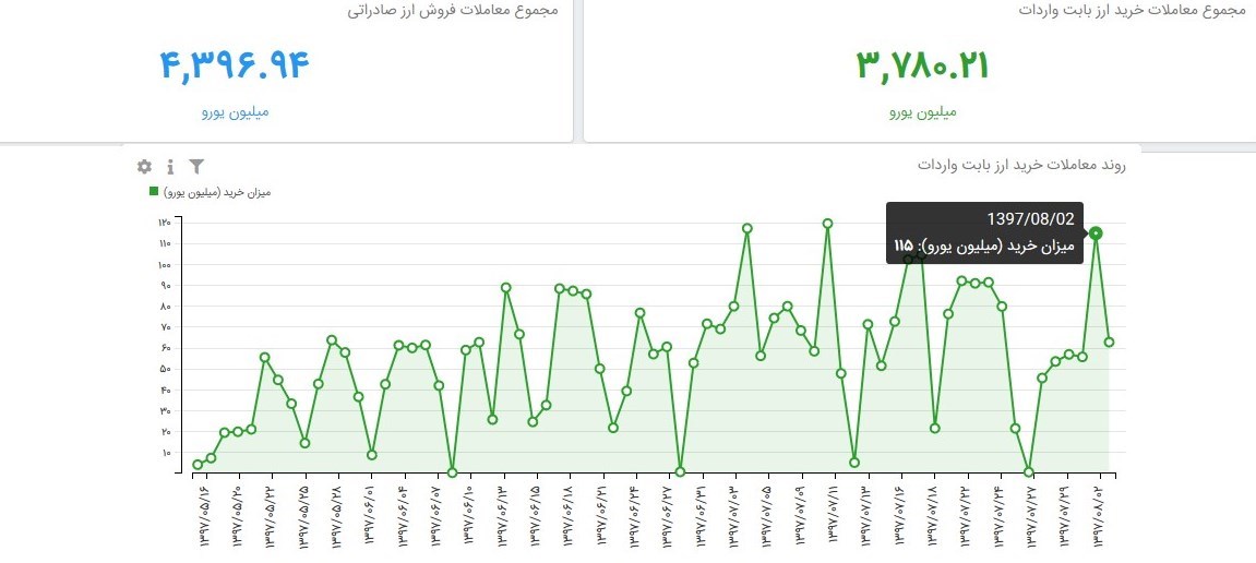 بر این اساس در روز دوم آبان ماه حدود 115 میلیون یورو ارز به واردکنندگان با میانگین قیمتی 9900 تومان به‌فروش رسیده است.