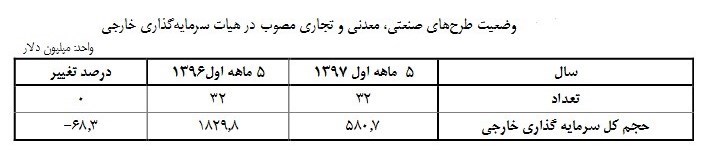 البته طبق آمار حجم کل سرمایه گذاری در این 32 طرح‌ 1829.8 میلیون دلار است که این میزان سرمایه گذاری خارجی در5 ماهه امسال نسبت به مدت مشابه در سال گذشته شاهد افت 68.3 درصدی است.