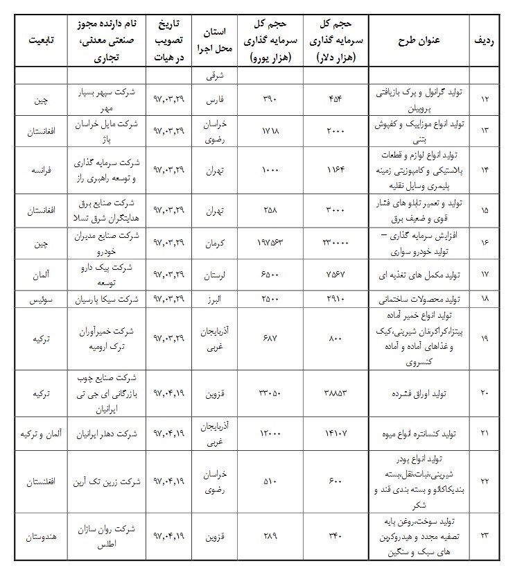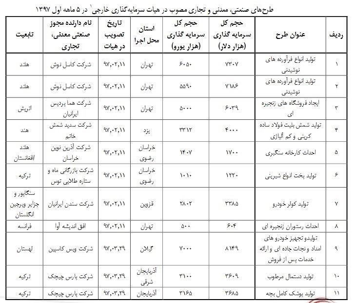 جزئیات سرمایه گذاری خارجی در بخش های مختلف صنعت و معدن طی 5 ماهه امسال به شرح زیر است: