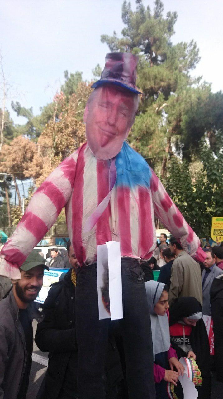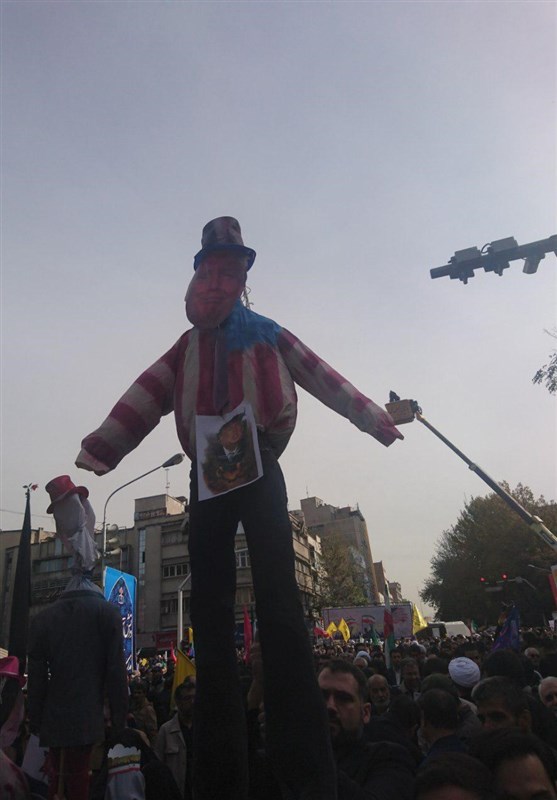 یکی از حاشیههای مراسم امسال در دست داشتن آدمک دونالد ترامپ رئیسجمهور آمریکا در دست تظاهراتکنندگان تهرانی بود که در ادامه تصاویری از آن را میبینید.