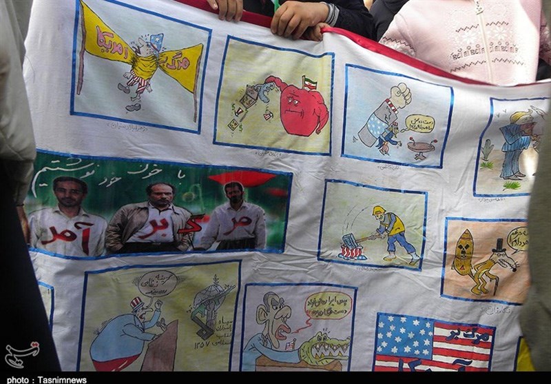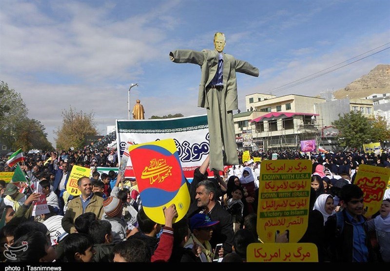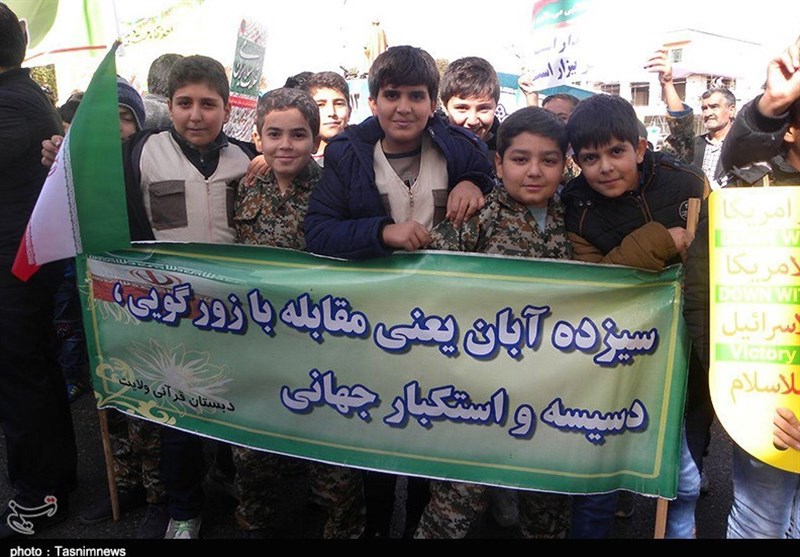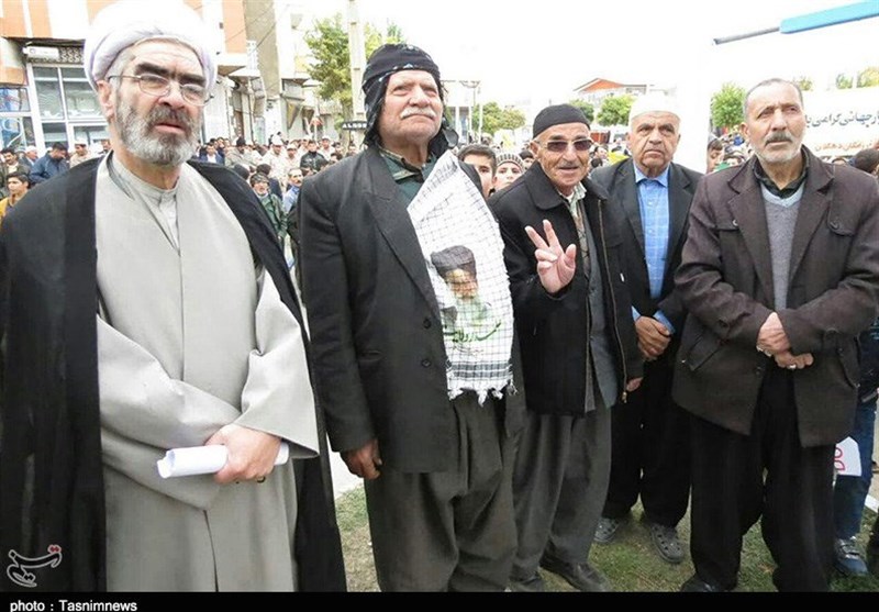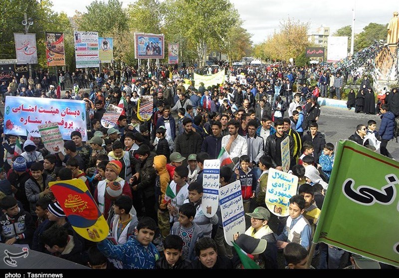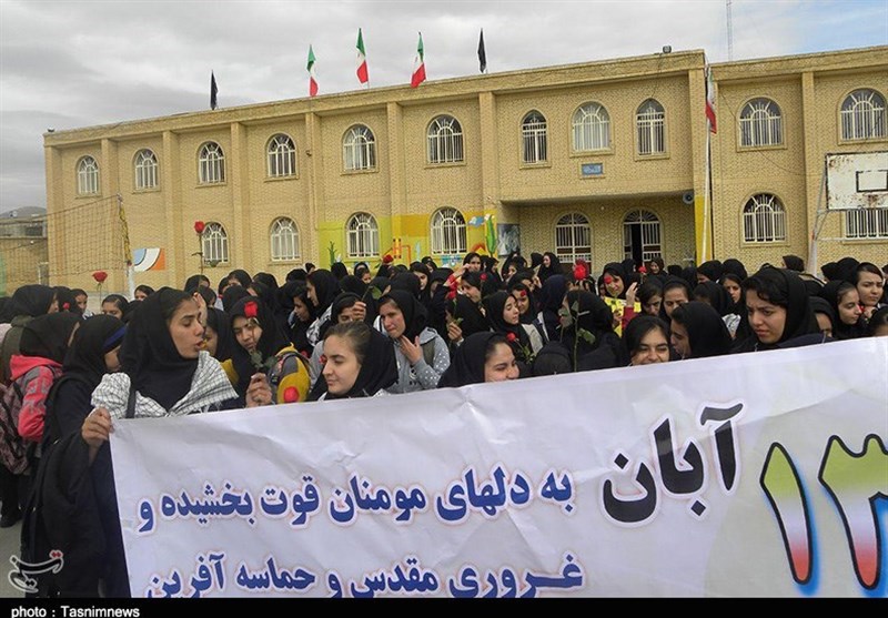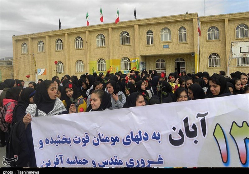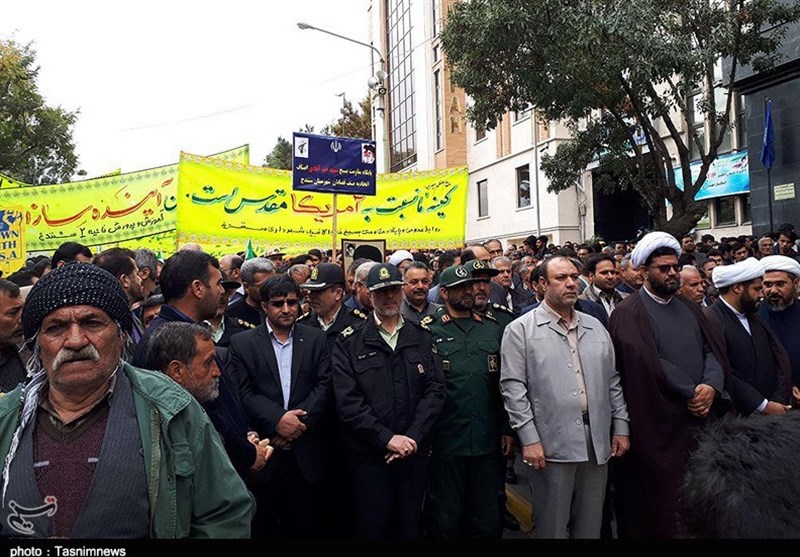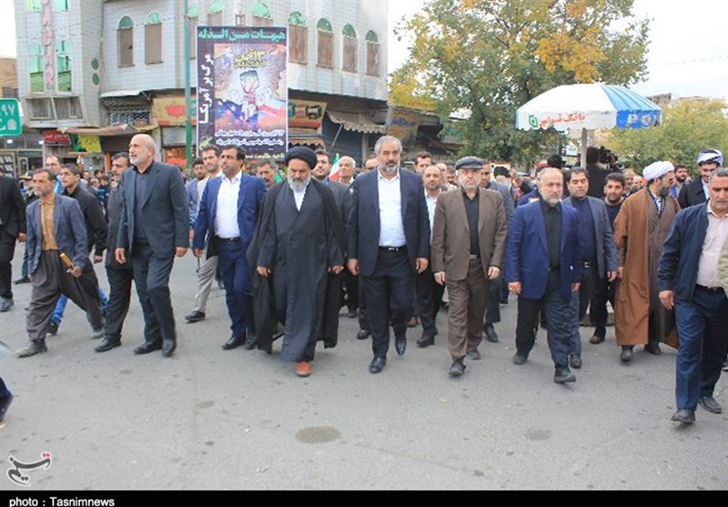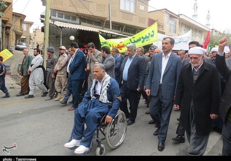 امروز مردم همیشه در صحنه و حماسه‌آفرین کردستان اعم از پیر و جوان، زن و مرد، شیعه و سنی، دانش‌آموزان و دانشجویان، روحانی و بازاری، نیروهای نظامی و انتظامی، فرهنگیان، خانواده معظم شهدا و ایثارگران، کارمند، کارگر و اقشار مختلف مردم با حضور پرشور خود در مراسم راهپیمایی 13 آبان بار دیگر به صحنه آمدند و با شعارها و فریادهای استکبارستیز «مرگ بر آمریکا، مرگ بر اسرائیل، مرگ بر انگلیس، مرگ بر آل‌سعود و داعش، مرگ بر منافق فتنه‌گر، ما همه سرباز توییم خامنه‌ای گوش به فرمان توییم خامنه‌ای» با آرمان‌های امام راحل(ره) و رهبر معظم انقلاب تجدید بیعت کردند و عزم و ایمان راسخ خود برای پاسداری از آرمان‌های انقلاب اسلامی و انزجار از تحریم‌های ظالمانه آمریکای جنایتکار را به دنیا نشان دادند و وحدت، برادری، یکدلی، عزت، اقتدار مقاومت و ایستادگی خود را به رخ استکبار و یاوه‌گویان کشاندند.