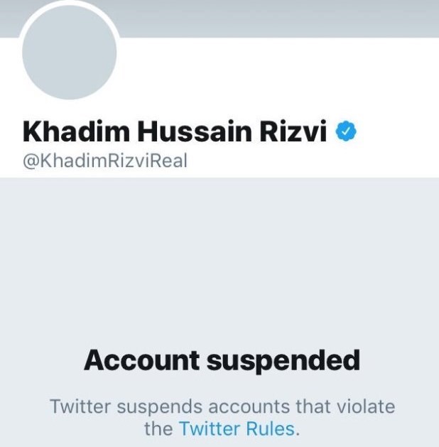 پس از درخواست رسمی دولت پاکستان مسئولین توئیتر اکانت رسمی «خادم حسین رضوی» رئیس جنبش لبیک یا رسول الله«ص» را مسدود کردند.درخواست مسدودیت اکانت وی پس از آن ارائه شد که خادم حسین رضوی از طریق توئیتر اقدام به تحریک جوانان به آشوبگری و اعتراضات خیابانی کرد.