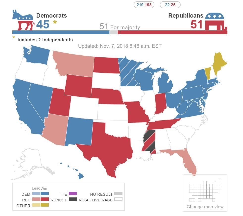 نتایج انتخابات 2018 آمریکا؛ جمهوریخواهان در سنا پیروز شدند و کرسیهای خود را به 51 افزایش دادند