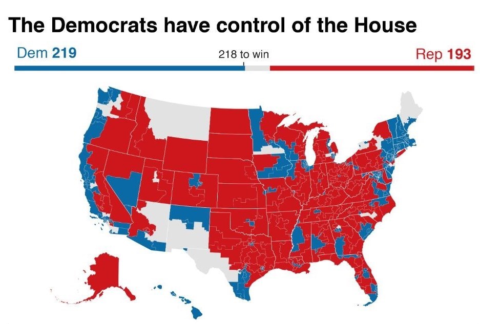 مجلس نمایندگان؛ پراکندگی کرسیهای جمهوریخواهان (193) و دموکراتها (219) در انتخابات سه شنبه
