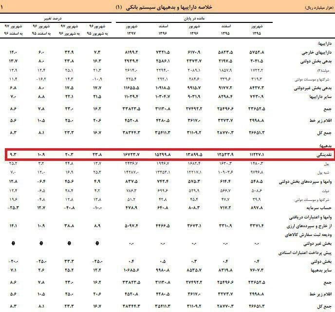 نقدینگی شهریور ٩٧ نسبت به شهریور ٩٦ معادل 20.3 درصد رشد داشته است.