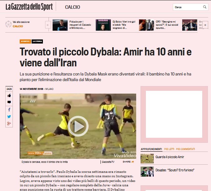 سایت شبکه اسکای اسپورت ایتالیا با اشاره به نحوه آشنا شدن دیبالا با کودک ایرانی ساکن دهدشت (از توابع استان کهگیلویه و بویر احمد) در اینستاگرام، درخواست بازیکن یوونتوس از طرفدارانش برای معرفی این کودک بااستعداد، کمک تلویزیون ایران برای شناسایی او نوشته است: با کمک تلویزیون ایران، «لا خویا» (لقب دیبالا) فهمید که دیبالای کوچکی که دنبالش میگشت چه کسی است و اطلاعات بیشتری درباره او به دست آورد. نام او امیر است و با خانوادهاش در دهدشت زندگی و در یک تیم محلی بازی میکند. اینطور که پیداست او عاشق و دنبال کننده فوتبال ایتالیاست و نیازی به معرفی الگویش نیست. او حتی به خاطر نرسیدن ایتالیا به جام جهانی 2018 گریه کرده است. حالا این قهرمان میتواند حتی به ملاقات مستقیم با دیبالا فکر کند تا برای داستان زیبایی که به لطف قدرت فوتبال نوشته شد، پایانی زیبا رقم بخورد.