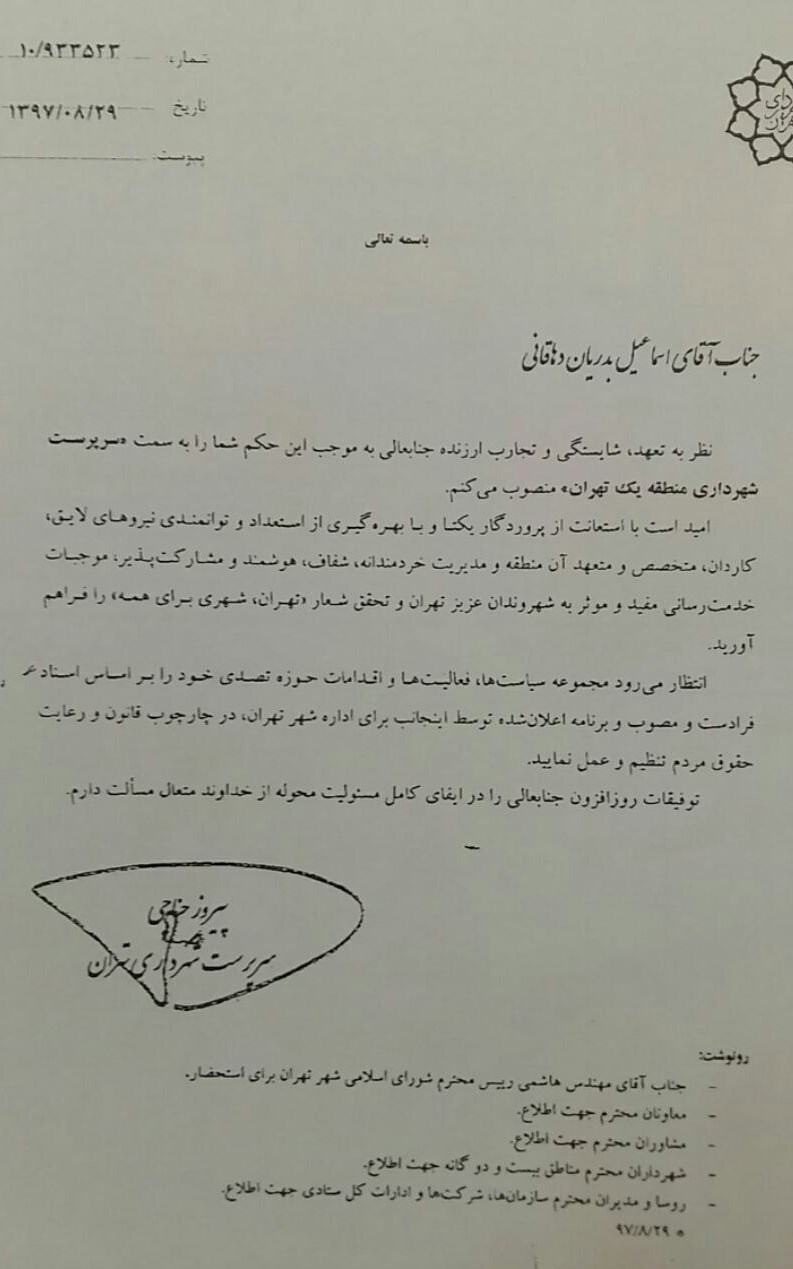 وی در حکمی تاجیک اسماعیلی شهردار بازنشسته منطقه یک را تغییر داد و اسماعیل بدریان دهاقانی را بهعنوان سرپرست شهرداری منطقه یک انتخاب کرد.