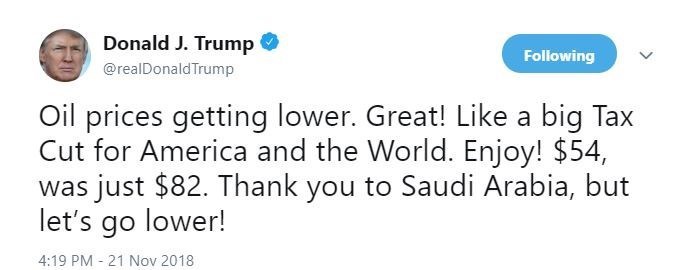 ترامپ در این پیام توئیتری، به خاطر نقشآفرینی عربستان در کاهش قیمت جهانی نفت، تشکر کرد.