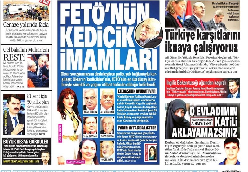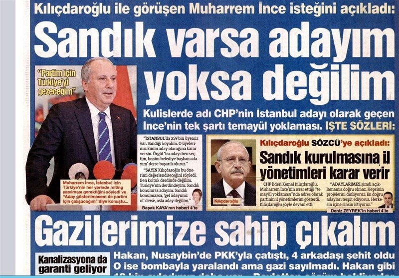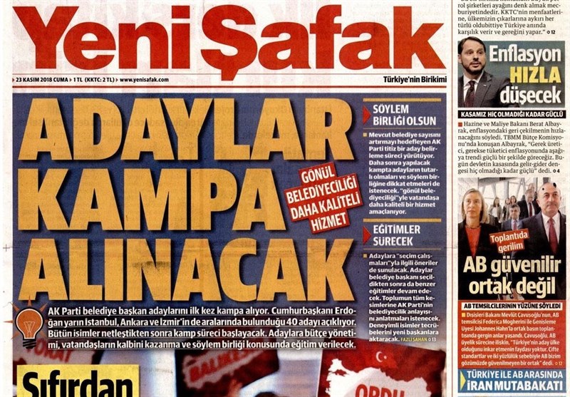 به گزارش گروه بینالملل خبرگزاری تسنیم، بسیاری از روزنامههای ترکیه، امروز در عکس و تیتر صفحه نخست، معرفی نامزدهای انتخاباتی آکپارتی را برجسته کردهاند. همچنین این روزنامهها موضوعات دیگری مانند ائتلاف بین اردوغان و باغچلی را مورد توجه قرار دادند.