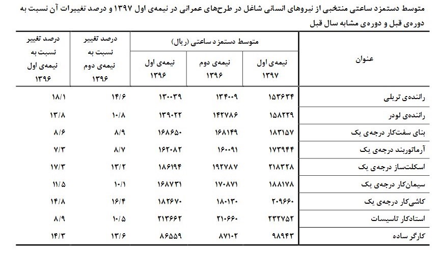 همچنین ، مقایسه ی متوسط دستمزد ساعتی در این دوره با دوره ی مشابه سال قبل نشان می دهد که بیش ترین افزایش دستمزد ساعتی مربوط به « راننده ماشین های سبک-سواری» با 28.5 درصد و کمترین افزایش دستمزد ساعتی مربوط به « جوش کار لوله های فولادی» با 4.0 درصد بوده است.