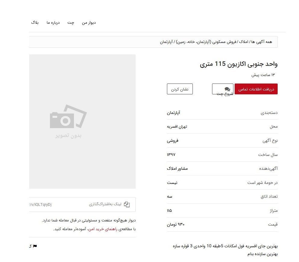 بهعنوان مثال در منطقه 14 (حوالی میدان خراسان) میانگین قیمت هر مترمربع واحد مسکونی 6.6 میلیون تومان است که با توجه به برخی پارامترها از جمله عمر بنا، امکانات آپارتمان، دسترسیها و... کمی از قیمت ذکر بالاتر یا پایینتر است، این در حالی است که سایتهای بهاصطلاح بدون واسطه برای خرید و فروش بعضاً آگهیهایی را بارگذاری میکنند که در واقع باعث بروز التهاب در بازار مسکن شده است. در نمونه که در ادامه میآید هر مترمربع واحد مسکونی با عمر 4 سال در افسریه با قیمت حدود 8 میلیون و 700 هزار تومان برای فروش در سایت دیوار بارگذاری شده، این در حالی است که متوسط قیمت در این منطقه بر اساس آمار رسمی وزارت راه و شهرسازی برای هر مترمربع 4.9 میلیون تومان است، یعنی تقریبا 4 میلیون گرانتر.
