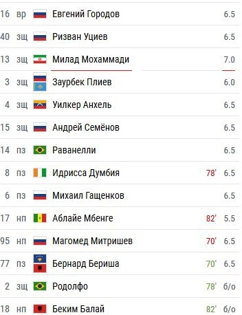به گزارش خبرگزاری تسنیم ، خبرگزاری ورزشی چمپیونات روسیه با مشارکت کاربرانش نمره خوب 7 را به بازی 90 دقیقهای میلاد محمدی در مصاف با انیسی کراسنویارسک اختصاص داد تا به عنوان بهترین بازیکن تیمش شناخته شود.