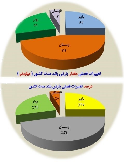 همانطور که در نمودار بالا مشخص است، در یک سال آبی نرمال، انتظار بارش 25 درصدی در پاییز و 46 درصدی در زمستان وجود دارد. با توجه به اینکه مجموع بارش‌های کشور در یک سال آبی نرمال حدود 249 تا 250 میلیمتر است، در سال آبی جاری بیش از 30 درصد بارش‌های یک سال آبی نرمال، در 70 روز نخست پاییز به ثبت رسیده است. یعنی تا امروز بیش از 5 درصد بیشتر از یک پاییز نرمال، بارش در فصل جاری داشته‌ایم.