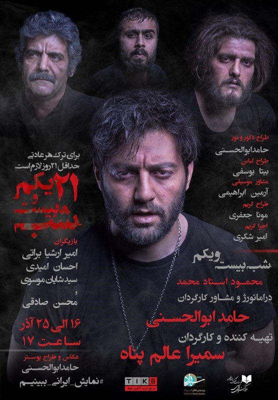 امیر ارشیا براتى، احسان امیدى، سید شایان موسوى و محسن صادقى بازیگران نمایش «شب بیست و یکم» هستند که بر اساس متنی از محمود استادمحمد و به کارگردانی سمیرا عالم‌پناه و دراماتوژی حامد ابوالحسنی از ١٦ آذر الى ٢٥ آذر در پردیس تئاتر شهرزاد روی صحنه می‌رود.