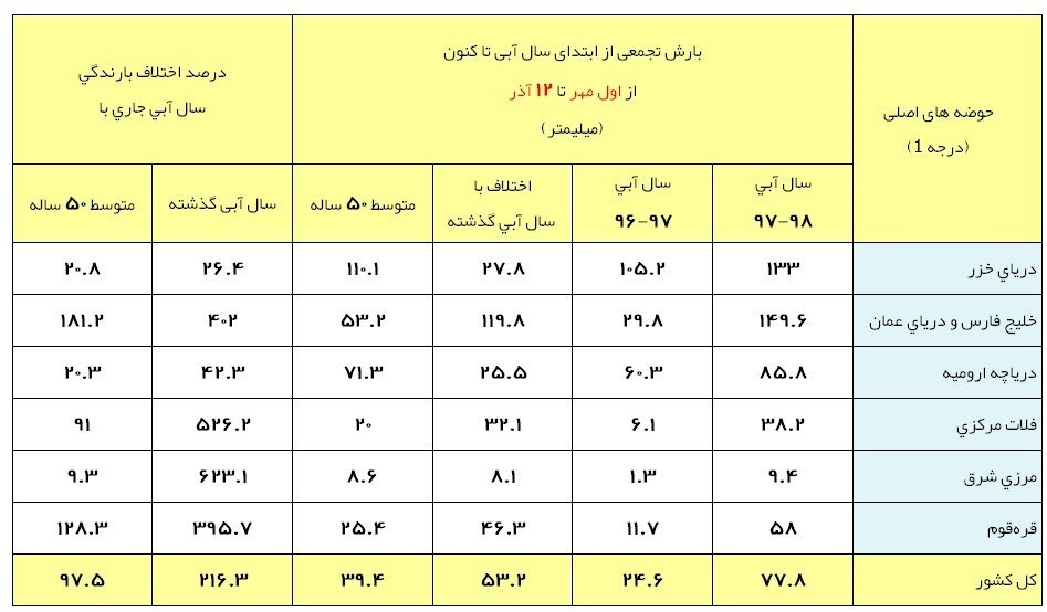 به گزارش خبرنگار اقتصادی خبرگزاری تسنیم ، بر اساس آمار رسمی دفتر مطالعات منابع آب شرکت مدیریت منابع آب ایران، ارتفاع کل ریزشهای جوی از اول مهر تا 12 آذر سال آبی 98-97 (72 روز ابتدایی سال آبی جاری) بالغ بر 77.8 میلیمتر است.