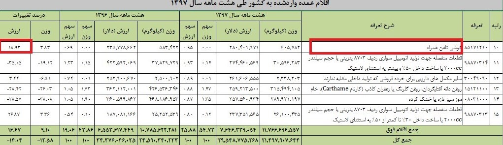 گفتنی است، کل واردات در 8 ماهه ابتدایی سال جاری حدود 29 میلیارد دلار بوده که نسبت به مدت مشابه سال قبل با افت 14 درصدی مواجه شده است. در هفت ماهه سالجاری تعداد یک میلیون و 737 هزار و 475 دستگاه گوشی تلفن همراه وارد کشور شده است. طی مهر ماه سالجاری 210 هزار و 611 دستگاه گوشی تلفن به کشور وارد شده بود.