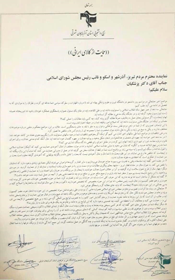 جناب آقای دکتر پزشکیان، نماینده محترم مردم تبریز، آذرشهر و اسکو و نائب رئیس مجلس شورای اسلامی؛ سلام علیکم؛ مواضع اخیر جنابعالی در مراسم روز دانشجو در دانشگاه تبریز و علوم پزشکی بهانهای شد تا درباره اظهارات و سلوک سیاسی شما مداقهای کرده و نظرتان را به مواردی که به تفصیل در ادامه میآید جلب کنیم: