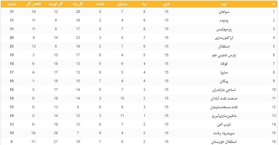جدول ردهبندی لیگ برتر فوتبال در پایان نیمفصل اول به شرح زیر است:
