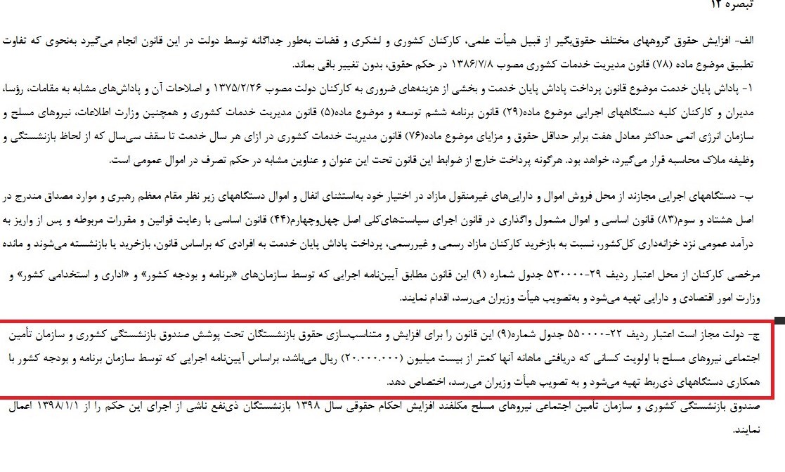 به گزارش خبرنگار اقتصادی خبرگزاری تسنیم ، بر اساس تبصره 12 لایحه بودجه سال 98، دولت مجاز است اعتبار یکی از ردیفهای جدول شماره 9این قانون را برای افزایش و متناسبسازی حقوق بازنشستگان تحت پوشش صندوق بازنشستگی کشوری و سازمان تأمین اجتماعی نیروهای مسلح با اولویت کسانی که دریافتی کمتر از 2 میلیون تومان در ماه دارند اختصاص دهد.