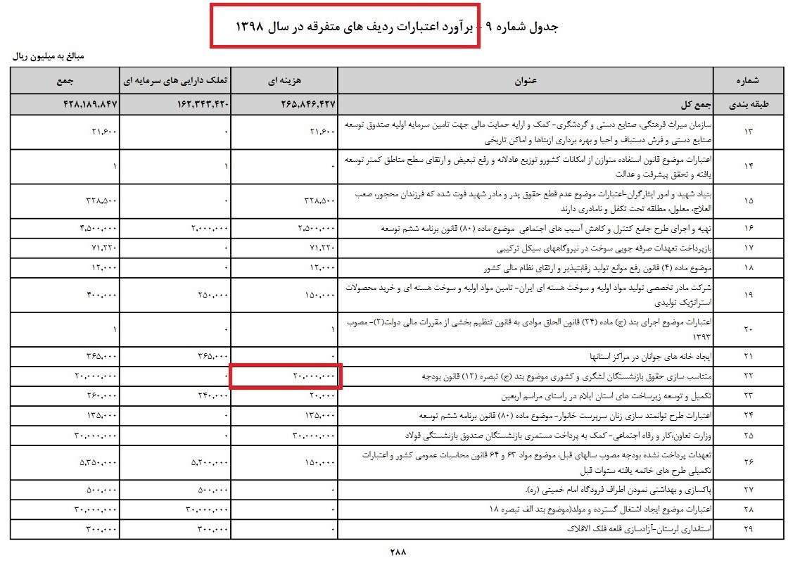 گفتنی است، بررسی جدول شماره 9 که به براورد اعتبارات ردیفهای متفرقه در سال 98 اختصاص دارد، اعتبار لحاظ شده برای متناسب سازی حقوق بازنشستگان لشگری و کشوری را 2هزار میلیارد تومان نشان میدهد.