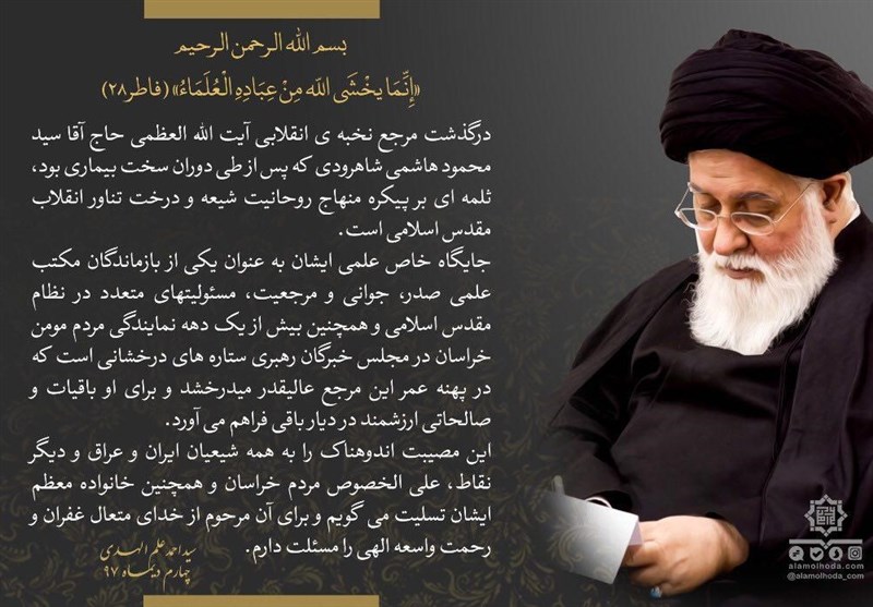 درگذشت مرجع نخبهی انقلابی آیتالله العظمی حاج آقا سیدمحمود هاشمیشاهرودی که پس از طی دوران سخت بیماری بود، ثلمهای بر پیکره منهاج روحانیت شیعه و درخت تناور انقلاب مقدس اسلامی است.