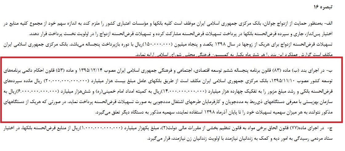 به گزارش خبرنگار اقتصادی خبرگزاری تسنیم ، بر اساس تبصره 16 لایحه بودجه در اجرای بند ب ماده 83 قانون برنامه 5 توسعه اقتصادی، بانک مرکزی مکلف است از طریق بانکهای عامل مبلغ 2هزار میلیارد تومان مانده سپرده قرض الحسنه بانکی و رشد مبلغ مزبور را به تفکیک 1400 میلیارد تومان به کمیته امداد و 600 میلیارد تومان به سازمان بهزیستی با معرفی دستگاههای زیربط به مدد جویان وکارفرمایان طر اشتغال مددجویان به صورت قرض الحسنه پرداخت نماید.