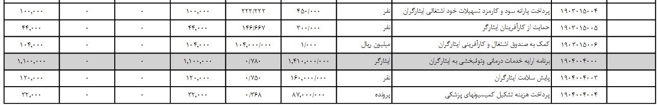 بودجه‌ای که برای پوشش بیمه سلامت ایثارگران پیش بینی شده است، 3 هزار میلیارد تومان و رقم پیشنهادی برای بودجه برنامه ارائه خدمات اجتماعی، فرهنگی و ورزشی به ایثارگران 700 میلیارد تومان است. همچنین بودجه پیشنهاد شده دولت برای برنامه تأمین حقوق، پاداش و مستمری ایثارگران 10 هزار میلیارد تومان و بودجه پیشنهادی برای برنامه تأمین مسکن ایثارگران 57 میلیارد تومان است. ضمنا رقم بودجه پیشنهادی دولت دوازدهم برای برنامه حمایت از اشتغال ایثارگران 56 میلیارد تومان و رقم پیشنهادی برای برنامه ارائه خدمات درمانی و توانبخشی به ایثارگران 110 میلیارد تومان است.