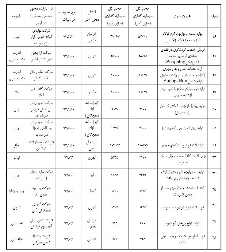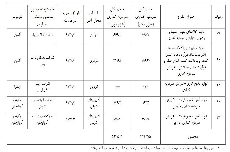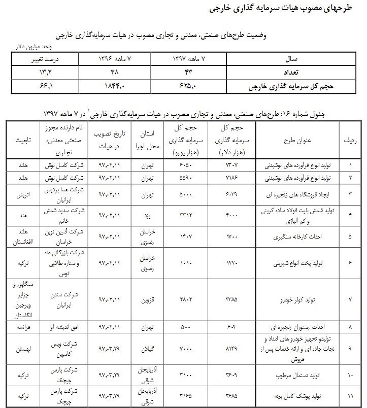 جزئیات سرمایه گذاری خارجی در بخشهای مختلف صنعت و معدن طی 7 ماهه امسال به شرح زیر است: