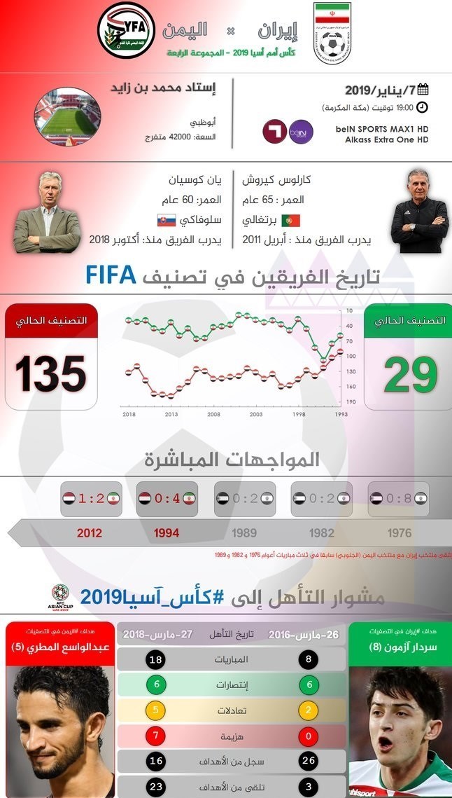 سایت اسپورت یمن نیز تصویری درباره بازی تیم ملی فوتبال این کشور برابر ایران منتشر کرد که در نوع خود جالب به نظر میرسد. معرفی سرمربیان تیمهای ملی فوتبال ایران و یمن به همراه تاریخ آغاز به کار آنها در این تیمها، محل برگزاری بازی و ساعت آن به وقت مکه، رنکینگ فیفا، تاریخچه بازیهای قبلی و بهترین گلزنها در این تصویر آمدهاند.