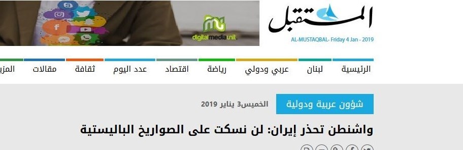 روزنامه المستقبل ارگان جریان المستقبل به ریاست سعدالحریری در تیتری با عنوان «واشنگتن به ایران هشدار داد، هرگز در قبال موشک‌های بالستیک سکوت نخواهیم کرد» به  تبلیغ و ترویج تهدیدهای آمریکا علیه جمهوری اسلامی ایران پرداخت و نوشت ایالات متحده آمریکا به ایران درباره ادامه پرتاب موشک‌های فضایی هشدار داد و از این کشور خواست تمام فعالیت‌های مرتبط با موشک‌های بالستیک را در صورتی که می‌خواهد از انزوای بیشتر اجتناب کند، متوقف کند.  المستقبل افزود ایالات متحده آمریکا در آگوست و نوامبر گذشته، دو بسته شدیدی از تحریم‌ها را علیه ایران تحمیل کرد که بخش‌های نفت، هواپیمایی، صنعت و نظام ارزی را هدف قرار داده است. این رسانه وابسته به جریان المستقبل با اشاره به اینکه دونالد ترامپ رئیس جمهوری آمریکا در می 2018 از توافق هسته‌ای با ایران(برجام) خارج شد، ادعا کرد این اقدام پس از آن صورت گرفت که تهران از درآمدهای این توافق در راستای تامین مالی فعالیت‌های موشکی و تسلیح شبه‌نظامیان تروریستی در منطقه خاورمیانه سوء استفاده کرد.