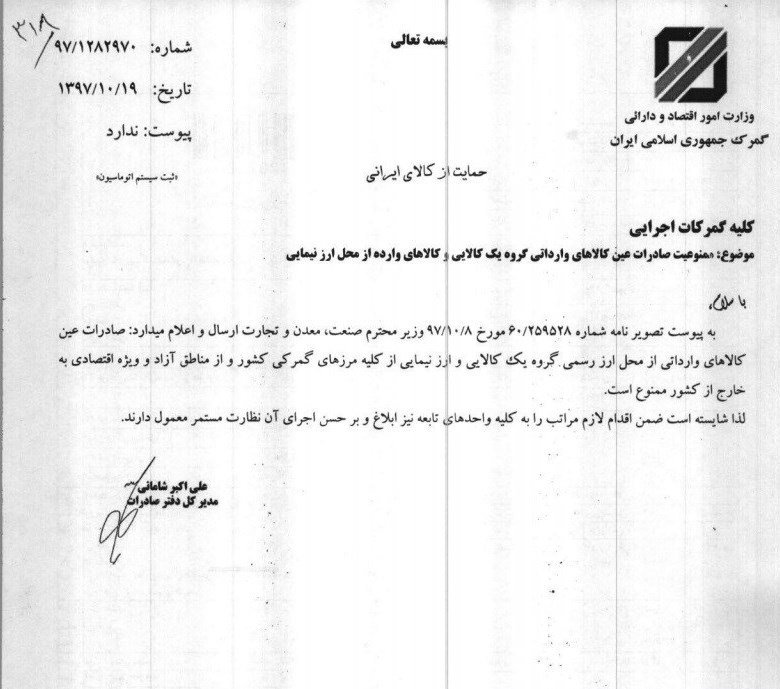 در نامه رئیس گمرک به کلیه گمرکات اجرایی نیز ممنوعیت صادرات کالای وارد شده با ارز نمایی و گروه یک کالایی از کلیه مناطق گمرکی و مناطق آزاد و ویژه اقتصادی ابلاغ شد. تصاویر این نامه ها به شرح زیر است.