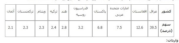 جدول 2- سهم کشورهای عمده از واردات محصولات کشاورزی و صنایع غذایی ایران در 9 ماهه سال 1397