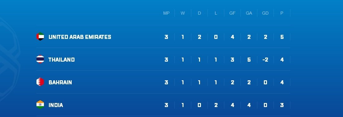 بحرین نیز باید منتظر دیگر نتایج تیمهای سوم گروهها باشد تا تکلیف صعودش مشخص شود. هند که در بازی اول تایلند را 4 بر یک شکست داده بود با 3 امتیاز در قعر گروه قرار گرفت و حذف شد.