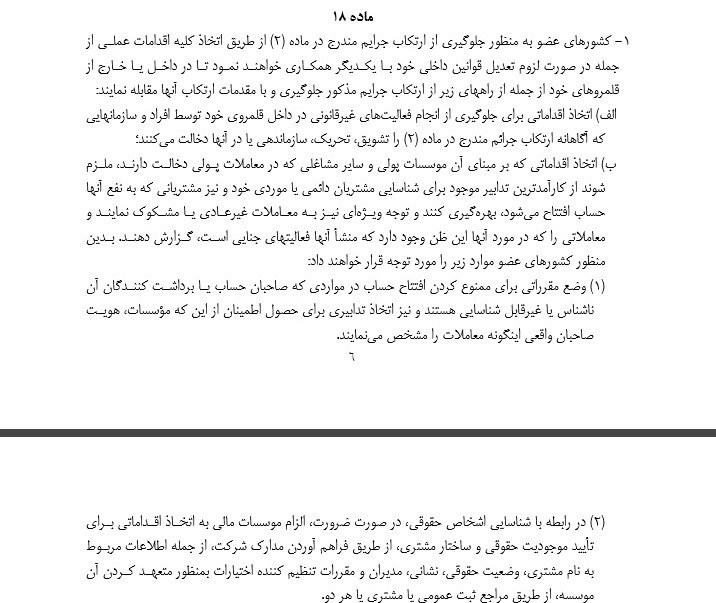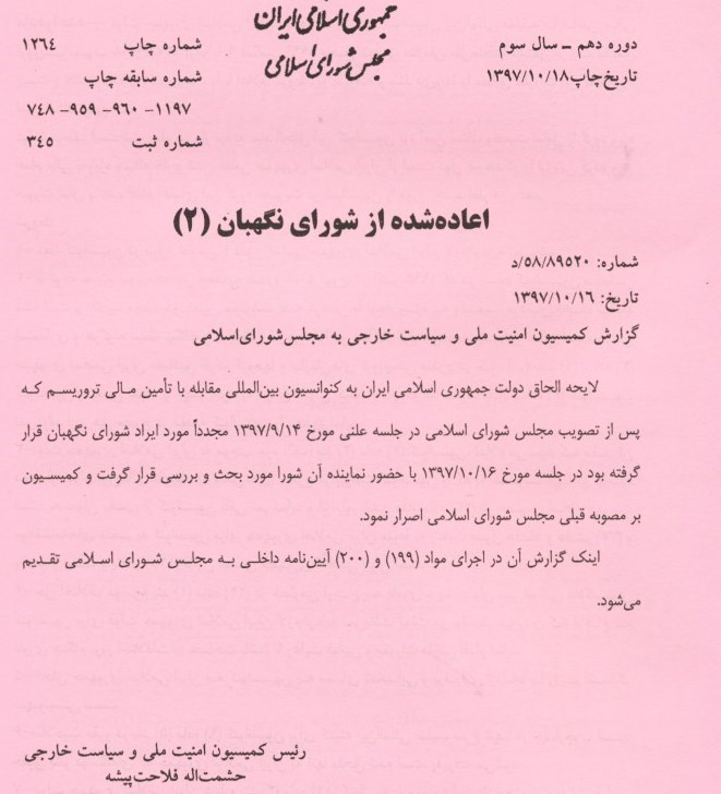 متن کامل مصوبه کمیسیون امنیتملی مجلس و ایرادات شورای نگهبان به لایحه الحاق دولت جمهوری اسلامی ایران به کنوانسیون بین المللی مقابله با تامین مالی تروریسم (CFT) به شرح زیر است: