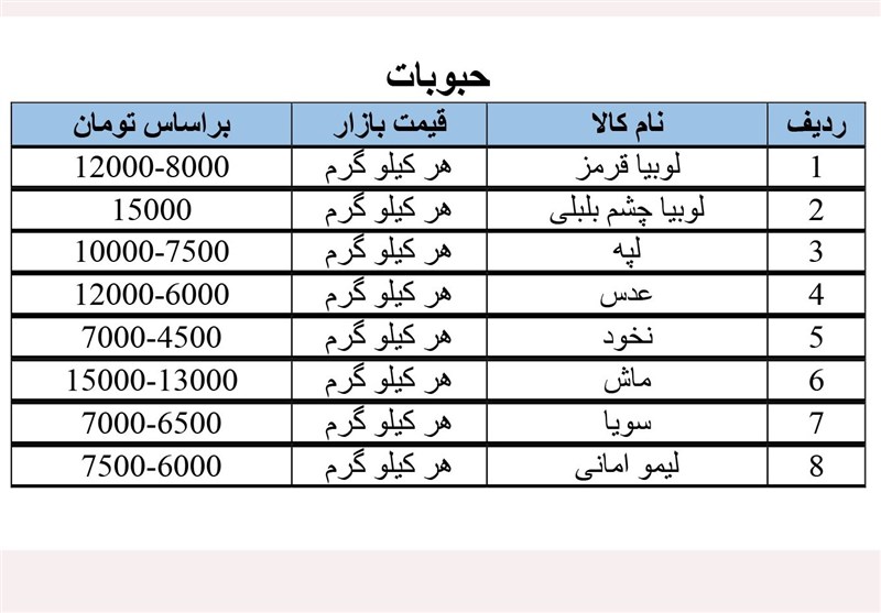 قیمت میوه, حبوبات, و مواد پروتئینی در ارومیه; سه شنبه 2 بهمن+جدول