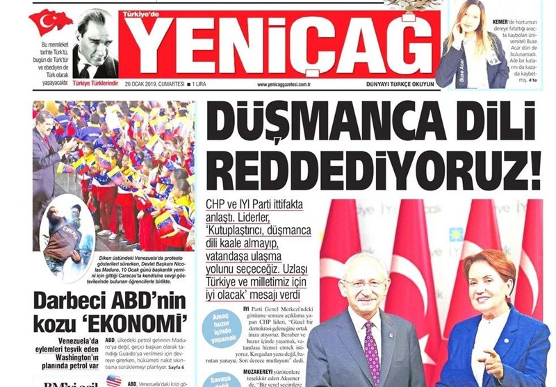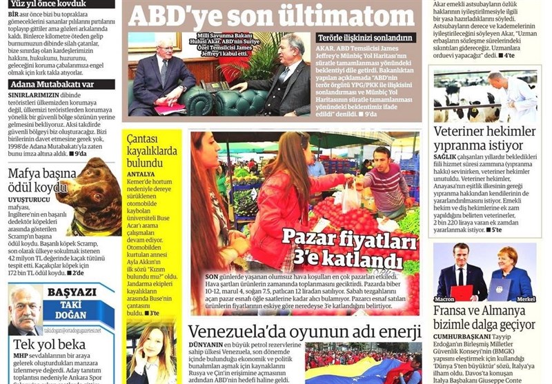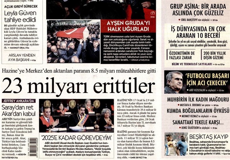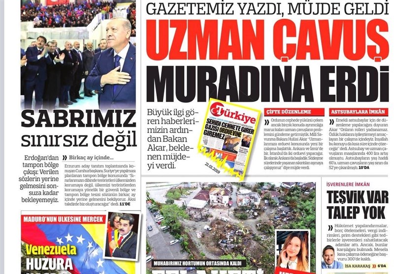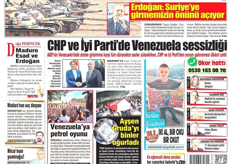 به گزارش گروه بینالملل خبرگزاری تسنیم، بسیاری از روزنامههای ترکیه، امروز در عکس و تیتر صفحه نخست، موضوع ناآرامی در ونزوئلا را برجسته کردهاند. همچنین این روزنامهها موضوعات دیگری مانند سخنان اردوغان در مورد منطقه امن شمال سوریه را مورد توجه قرار دادهاند.